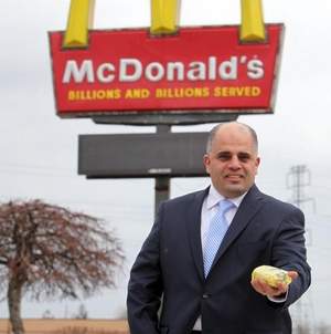 Dearborn attorney Majed Moughni stands holding a supposed halal chicken sandwich in front of a McDonald’s in Dearborn at 13158 Ford Road that sold fake halal sandwiches Thursday, Jan. 31, 2013. There was a settlement for this case, but he led an effort to oppose it. / REGINA H. BOONE/Detroit Free Press